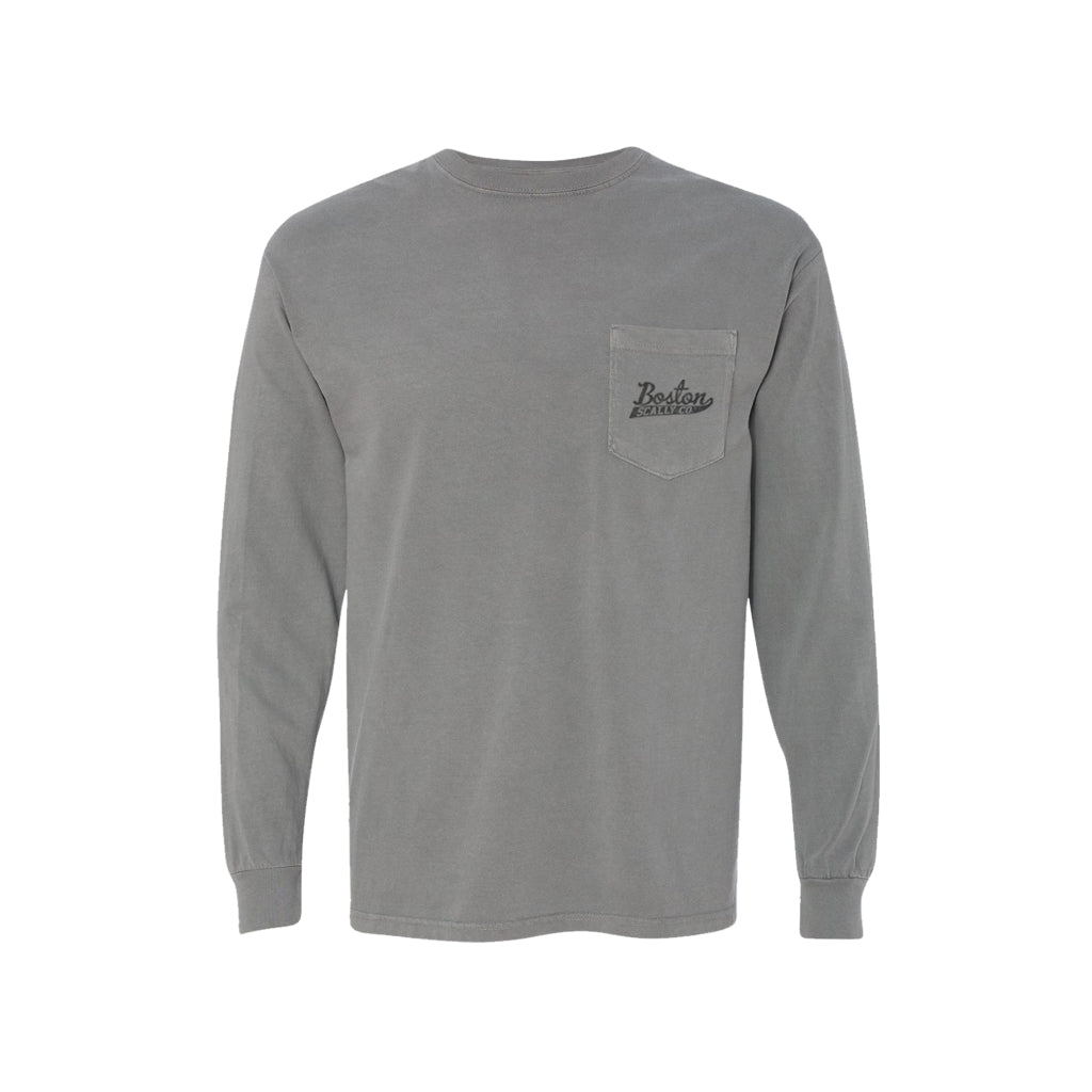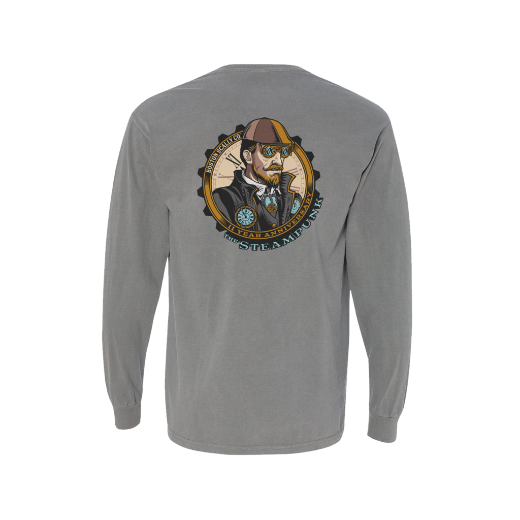 Meet the 11 Year Anniversary Long Sleeve Pocket Tee in Grey — a tribute to Boston Scally’s legacy. Crafted from 100% ring-spun cotton, this long sleeve features the classic Boston Scally Co. script logo on the front left chest and the bold ‘Steampunk’ logo on the back. Whether you're celebrating our journey or adding a unique piece to your wardrobe, this tee blends comfort, durability, and timeless style.