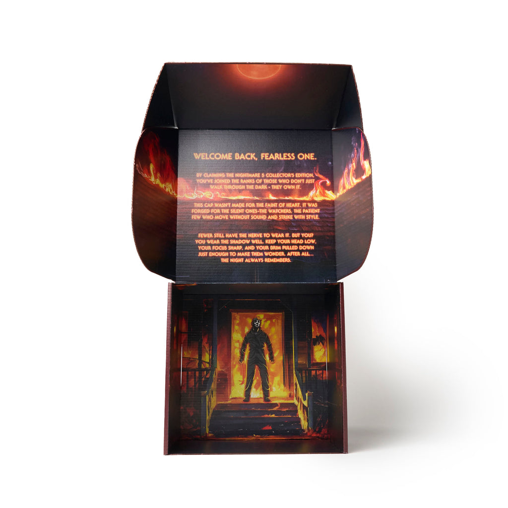 The ‘Nightmare 5’ is a collector’s edition 8-panel patchwork for true horror fans. Dark, textured panels in shades of brown, canvas blue, and black meet a blood-stained white brim, while the lining reveals a haunting logo of the masked figure walking from a nearby house engulfed in flames.